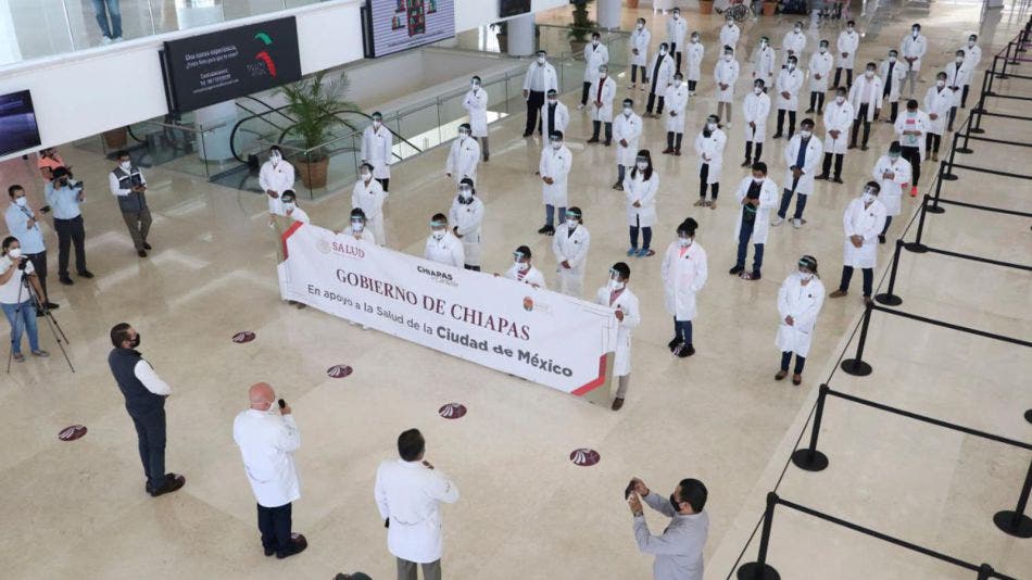 Por lo que la Secretaría de Salud de Chiapas se solidariza e informó que 50 trabajadores fueron enviados a la Ciudad de México para apoyar en la lucha por el covid-19; 25 médicos y 25 enfermeras y enfermeros, fueron enviados vía aérea.