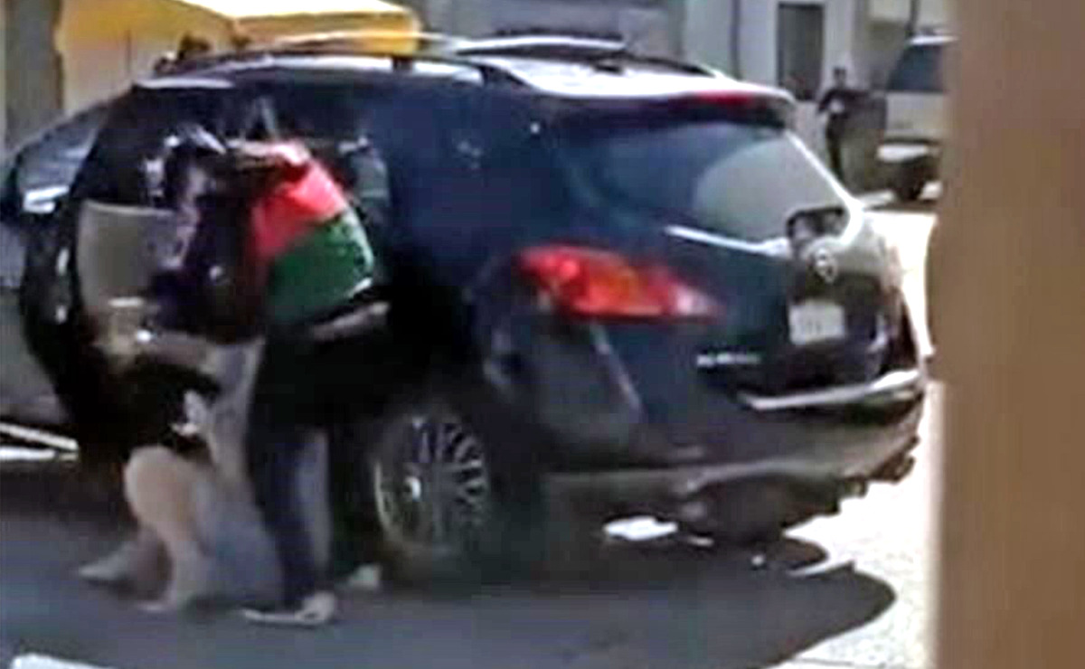 En redes sociales, circulan los videos donde se observa a la mujer con vestido azul y botines cafés, cabello rizado, y con un celular y cubrebocas blanco en mano, quien es llevada al estacionamiento a empujones mientras repite que está cooperando.