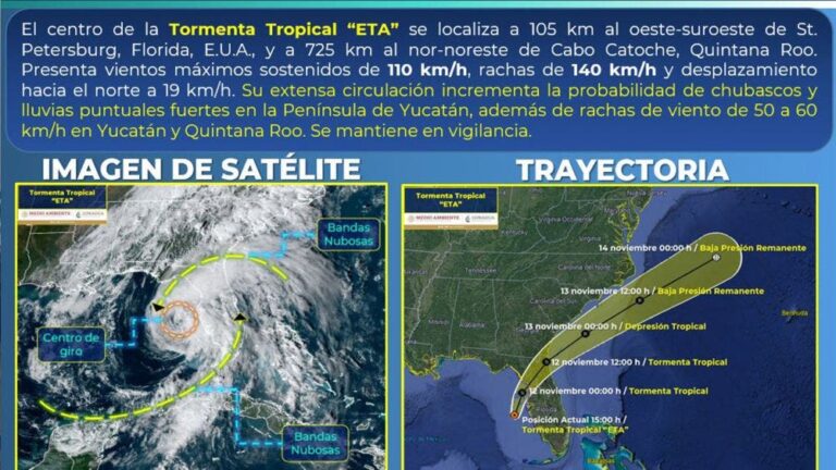 El centro de la Tormenta Tropical Eta, se localizó al oeste de Florida, EUA., aproximadamente a 725 kilómetros al nor-noreste de Cabo Catoche, Quintana Roo y a 210 kilómetros al oeste-suroeste de Fort Myers, Florida, Estados Unidos, informó la Conagua.