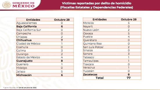 Los datos duros del informe diario sobre asesinatos en México, señalan que el 23 de octubre sumaron 90 víctimas; el 24 de octubre, 82; 25 de octubre, 91; 26 de octubre, 88; 27 de octubre, 92; mientras que el 28 de octubre se detallaron 77.