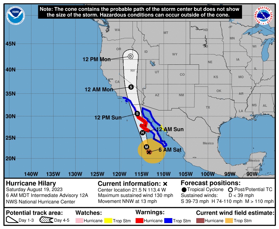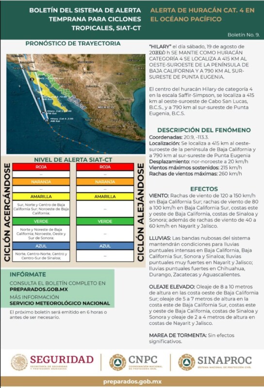 Mientras, el gobierno de Baja California decretó suspensión parcial de actividades para este sábado, y cierre total para domingo y lunes, ante la llegada de Hilary, que impactará a los siete municipios del estado y llegará como “una robusta tormenta tropical” alrededor de la medianoche del domingo, según informaron meteorólogos de San Diego, California.