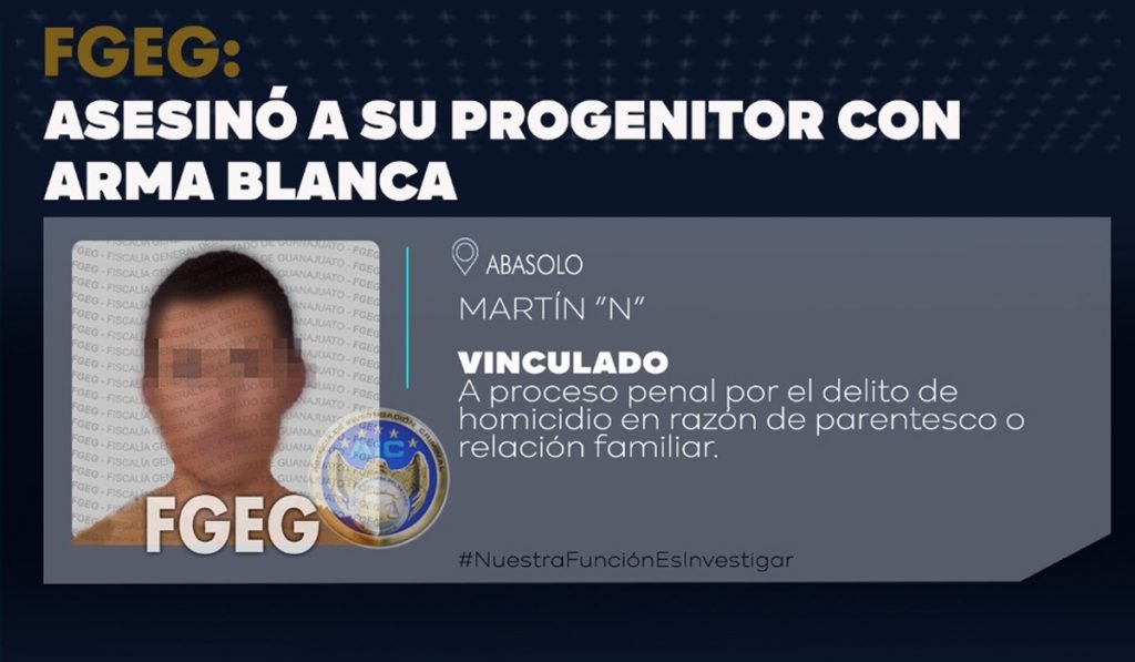 Martin «N», quien dio muerte a su padre tras asestarle 24 cuchilladas porque no lo dejó drogarse y lo regañó, fue sentenciado hoy a una pena inconmutable de 17 años de prisión en Abasolo Guanajuato al reconocer que mató al autor de sus días.