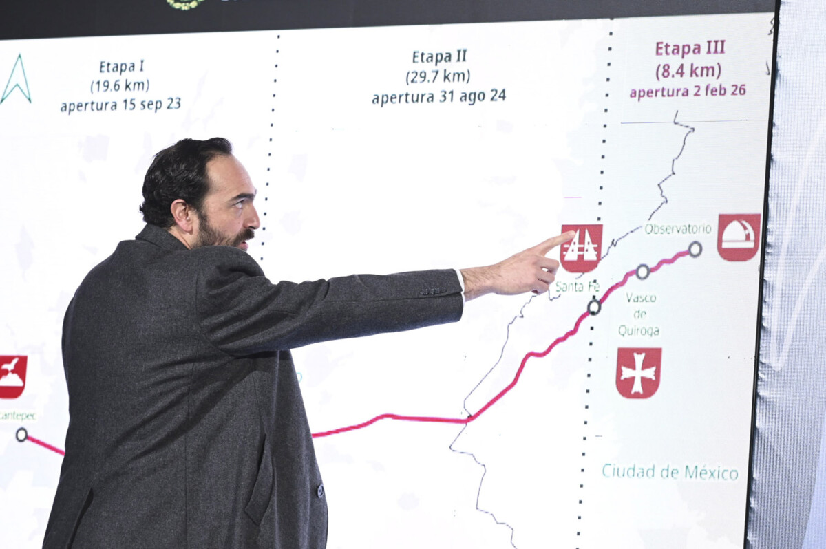 “Etapa uno de 19.6 km en el año 2023, después tenemos de Lerma a Santa Fe en donde no hay estaciones, por donde se cruza propiamente las montañas que dividen estos dos valles, y esa apertura se hizo el 31 de agosto de 2024 todavía con el presidente López Obrador y la presidenta electa en ese momento. Este es el tramo que está abriendo hoy, 2 de febrero: Santa Fe, Vasco de Quiroga y Observatorio, los últimos 8.4 km”.