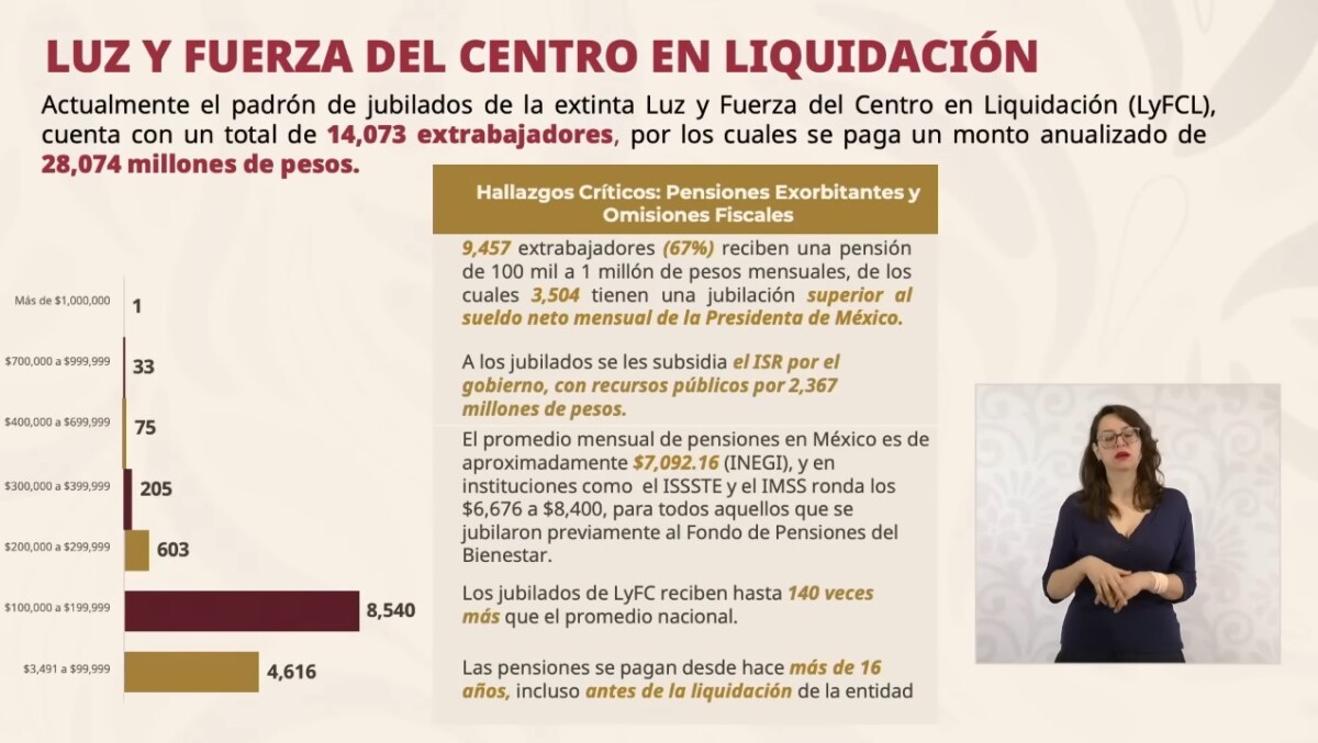 Al hacer un recuento de lo que actualmente se paga a ex trabajadores de los entes públicos con las pensiones más altas y fuera de rango en el gobierno federal, Raquel Buenrostro destacó que las pensiones de LFC representan hasta 140 veces más que el promedio nacional.