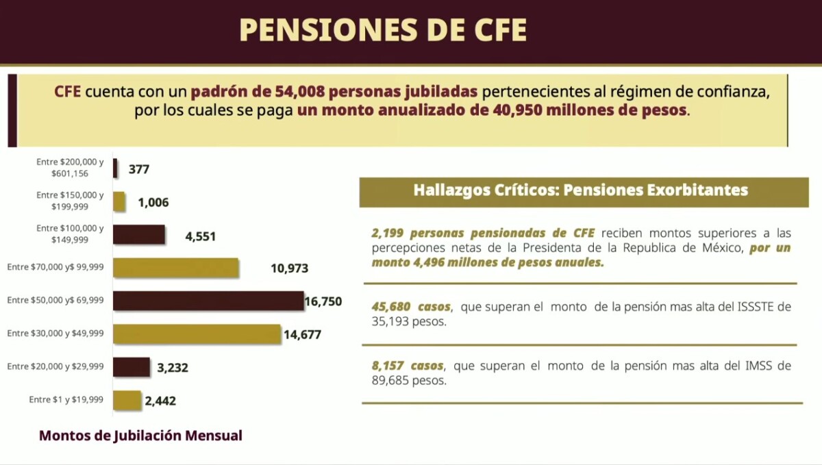 En la CFE hay 54 mil 8 jubilados de confianza que reciben anualmente 40 mil 950 millones de pesos. De ellos, 2 mil 199 también perciben montos superiores al sueldo de la mandataria, lo que representa 4 mil 496 millones de pesos.