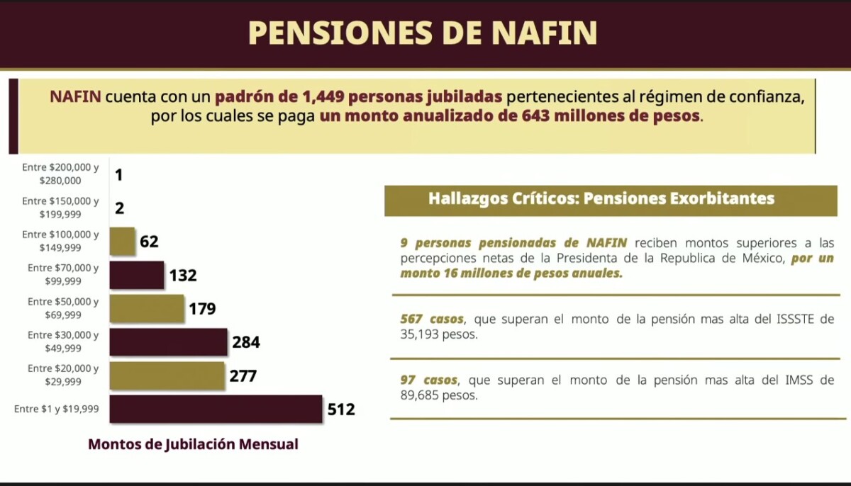 Mencionó que hay mil 449 jubilados de Nafin que reciben 643 millones de pesos al año. Tan sólo nueve, con ingresos superiores al salario de la titular del Ejecutivo federal, suman 16 millones de pesos. Y 657 superan la pensión más alta del ISSSTE, y 97, la del IMSS.