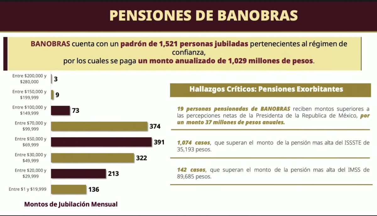 En Banobras encontraron mil 521 jubilados, por los cuales se paga un monto anualizado de mil 29 millones de pesos. Diecinueve personas perciben más que la Presidenta, esto es, 37 millones de pesos.