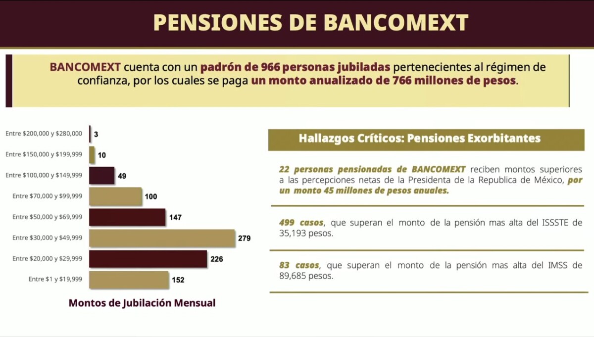 Finalmente, a 966 jubilados de Bancomext se les destinan anualmente 766 millones de pesos. Tan sólo 22 reciben al año 45 millones de pesos.