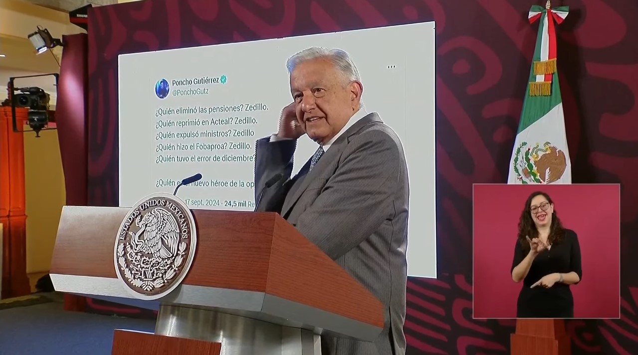 Posteriormente, López Obrador pidió que se proyectara la publicación que escribió uno de los reporteros que estaba en la “mañanera” (Poncho Gutiérrez) sobre el expresidente mexicano. “‘¿Quién eliminó las pensiones? Zedillo. ¿Quién reprimió en Acteal? Zedillo. ¿Quién expulsó ministros? Zedillo’. Pero ahí hay que agregar que los maiceó muy bien. ‘¿Quién hizo el Fobaproa? Zedillo. ¿Quién tuvo el error de diciembre? Zedillo’”, leyó el mandatario.