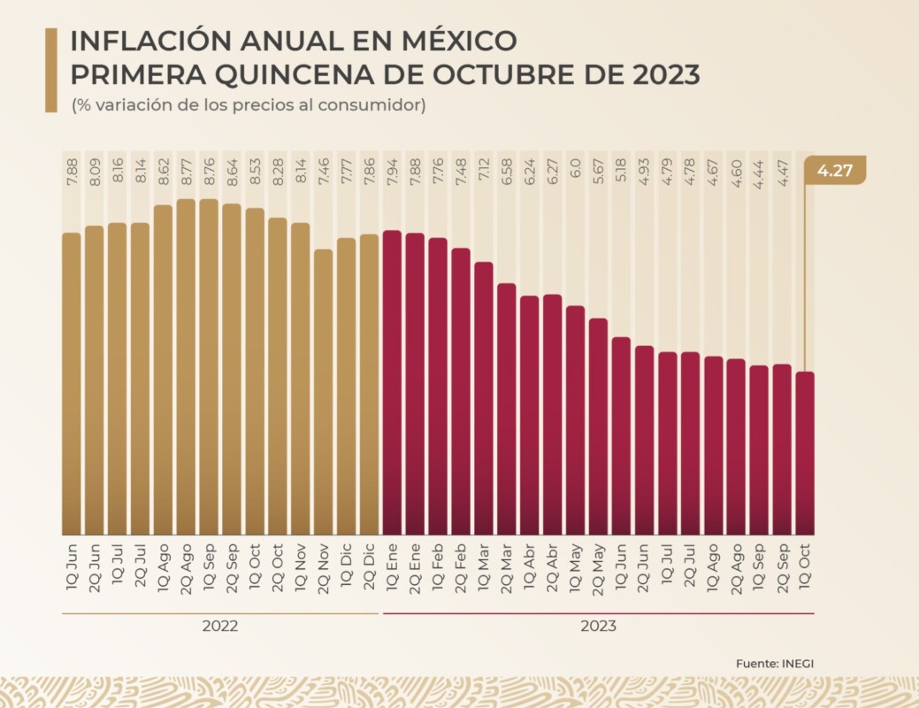 El mandatario destacó la continua tendencia a la baja de la inflación anual en México; se ubicó en 4.27 por ciento en la primera quincena de octubre, de acuerdo con datos del Instituto Nacional de Estadística y Geografía (INEGI), publicados este día.