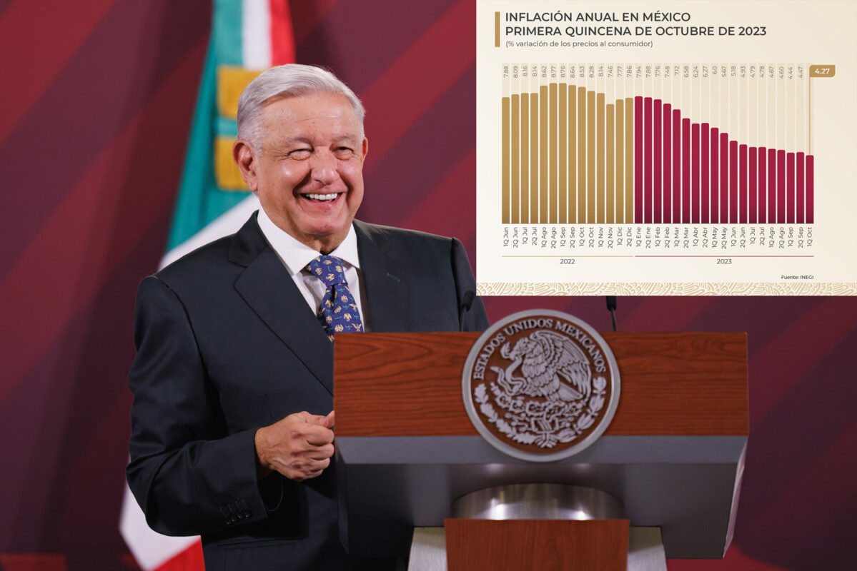 El mandatario destacó la continua tendencia a la baja de la inflación anual en México; se ubicó en 4.27 por ciento en la primera quincena de octubre, de acuerdo con datos del Instituto Nacional de Estadística y Geografía (INEGI), publicados este día.