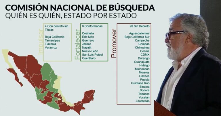 El Sistema Nacional de Búsqueda está conformado por 42 miembros de instituciones públicas (PF, SEE, Segob, FGR, entre otros). Un reto fundamental será la conformación se las comisiones locales, pues a la fecha sólo hay ocho; en otras cuatro estados hay ya el decreto que permite su conformación. En 20 entidades, a más de un año de publicarse la Ley General, no se han tomado las medidas para integrar sus comisiones.