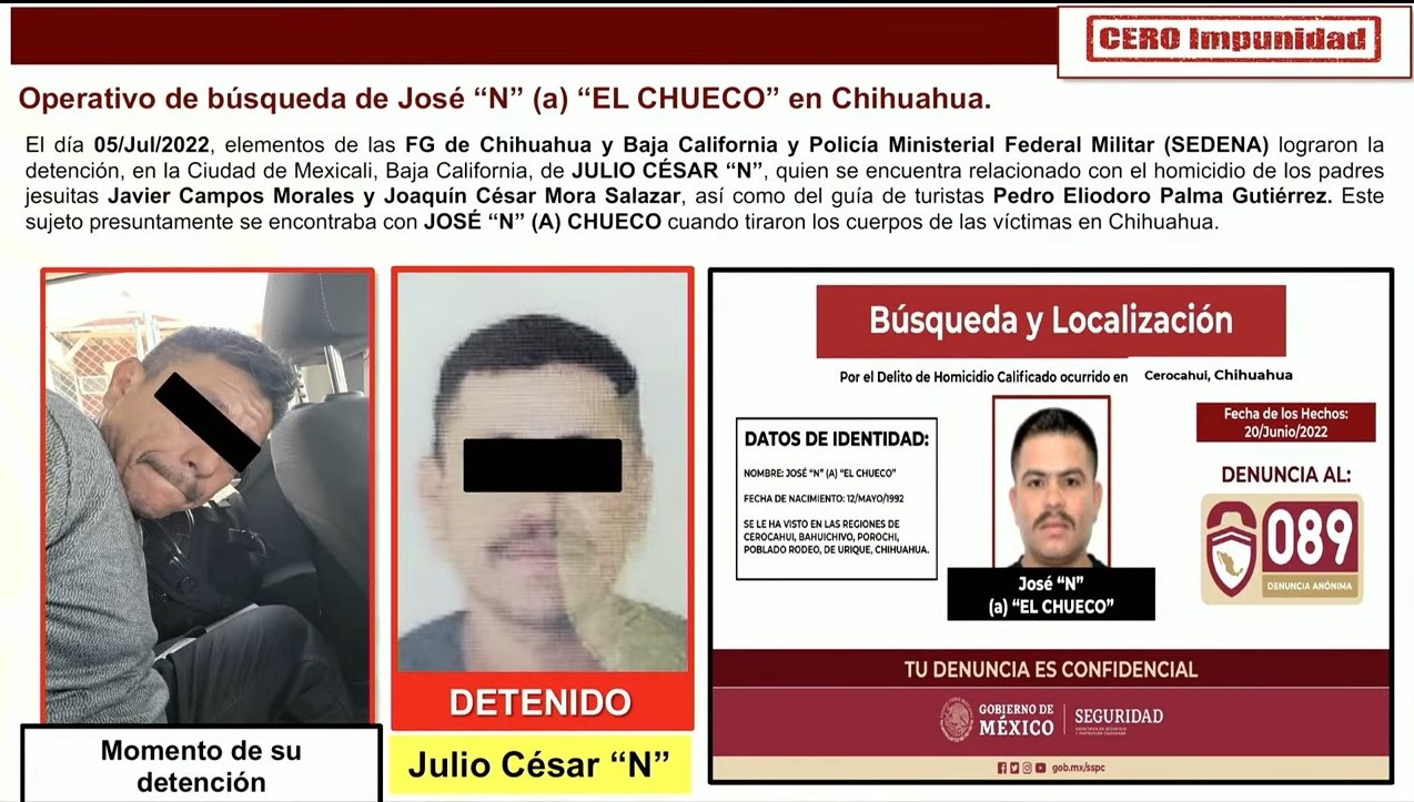 Se trata del presunto responsable del asesinato de los sacerdotes jesuitas Javier Campos y Joaquín Mora, así como del guía de turistas Pedro Palma, en Cerocahui, municipio de Urique, Chihuahua, en junio del año pasado.