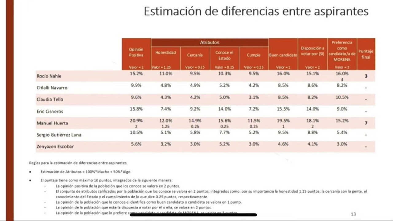En distintos parámetros, fue Huerta quien obtuvo la mayor cantidad de respaldo de la población, pero en la gráfica final, presentada por el dirigente nacional del partido, Mario Delgado, se explica que en suma, Nahle obtuvo el 16 por ciento, por 15.2 por ciento de Huerta, debido a que Nahle ganó la pregunta central.