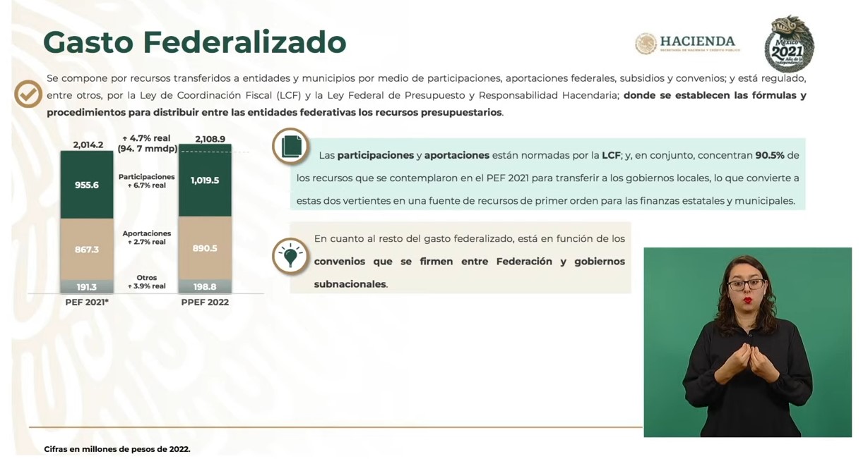 La buena noticia es que van a aumentar las participaciones, señaló. Para 2022 aumentan las participaciones; van a llegar más fondos, más dinero a estados y municipios, manifestó.