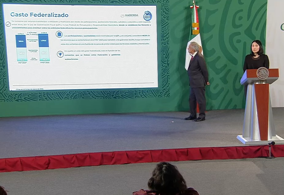 La buena noticia es que van a aumentar las participaciones, señaló. Para 2022 aumentan las participaciones; van a llegar más fondos, más dinero a estados y municipios, manifestó.