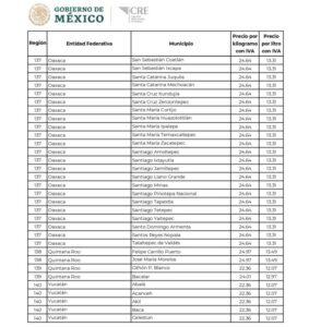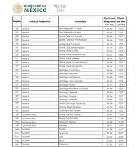 En Quintana Roo, los municipios de Benito Juárez, Isla Mujeres, Solidaridad, Tulum y Puertos Morelos, pagarán por kilo 22.48, en tanto en Othón P. Blanco 22.36, Lázaro Cárdenas 23.37, Bacalar 24.01, Cozumel 24.26 y Felipe Carrillo Puerto y José María Morelos costará 24.97.