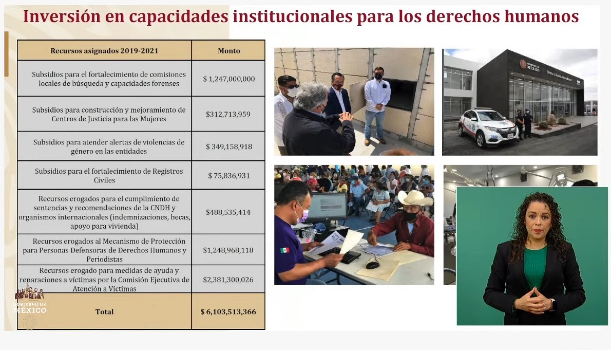 Destacó que, en tres años de gobierno, el presupuesto destinado por parte de la Secretaría de Gobernación a la procuración de los derechos humanos en el país asciende a 6 mil 103 millones 513 mil 366 pesos. Estos recursos han contribuido al fortalecimiento de las políticas públicas y a que se alcancen cifras sin precedentes en acciones de atención.