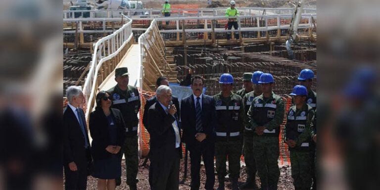 Junto a los secretarios de la Defensa Nacional, y la Marina, Luis Cresencio Sandoval y el almirante, Rafael Ojeda Durán, el jefe del Ejecutivo observó los avances que hay en las instalaciones desde un vehículo.