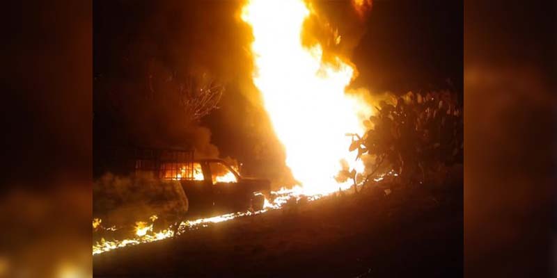 Toma clandestina calcina camionetas en Hidalgo.- Las autoridades en Hidalgo recibieron una llamada de emergencia que indicaba que había un incendio en una toma clandestina detectada en un ducto de Petróleos Mexicanos, por lo que iniciaron una intensa movilización y al llega encontraron dos camionetas calcinadas.
