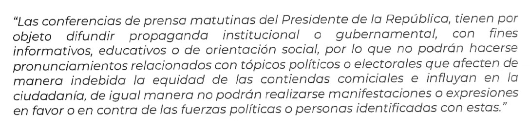 “Están ahora pidiéndonos que pongamos un letrero antes de comenzar la conferencia que diga : ‘las conferencias de prensa matutinas del Presidente tienen por objeto difundir propaganda gubernamental, institucional o gubernamental, con fines informativos o de orientación social, por lo que no podrán hacerse pronunciamientos relacionados con tópicos políticos o electorales que afecten de manera indebida la equidad de la contienda comicial e influyan en la ciudadanía, de igual manera no podrán realizarse manifestaciones a favor o en contra de las fuerzas políticas o personas identificadas con éstas”.