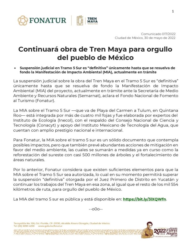 “Fonatur considera que existen suficientes elementos para que la MIA sobre el Tramo 5 Sur sea autorizada, lo cual en su momento permitirá superar la suspensión ‘definitiva’ otorgada por el Juez Primero de Distrito en Yucatán y continuar los trabajos del Tren Maya en esa zona, al igual que el resto de los mil 554 kilómetros de ruta, para orgullo del pueblo de México”, añadió.