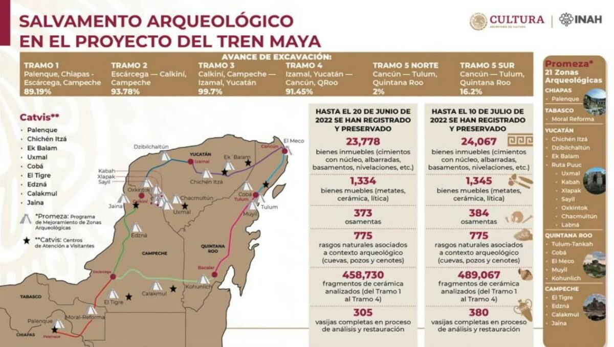 “Por supuesto que en el tramo cinco hay hallazgos, pero lo mismo hay en todos los tramos, que si se cambia el trazo, pues igual va a haber muchos hallazgos. El problema no es el trazo, el problema es el acompañamiento arqueológico para poder recuperar el material”, aclaró.