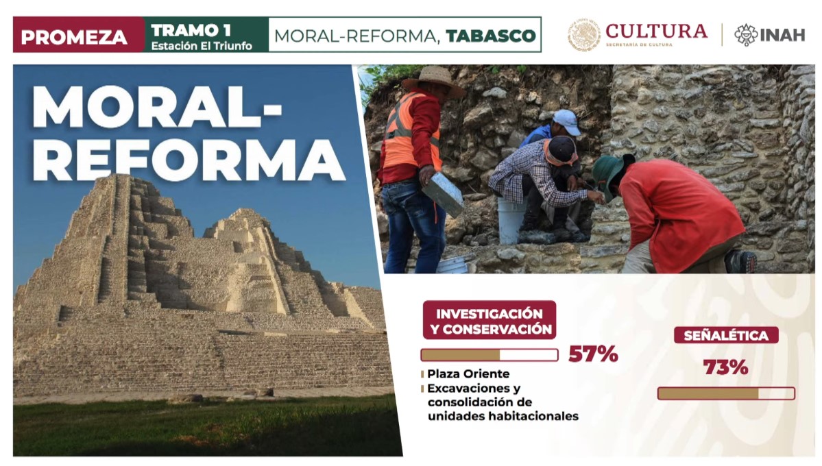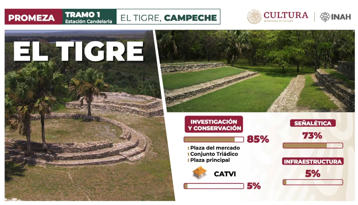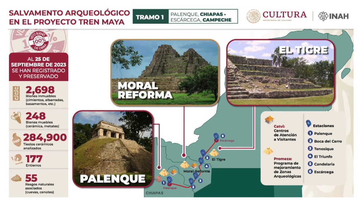Prieto también dio a conocer los avances en las tres zonas arqueológicas que están a lo largo del Tramo 1 del Tren Maya: Palenque, Moral Reforma y El Tigre.