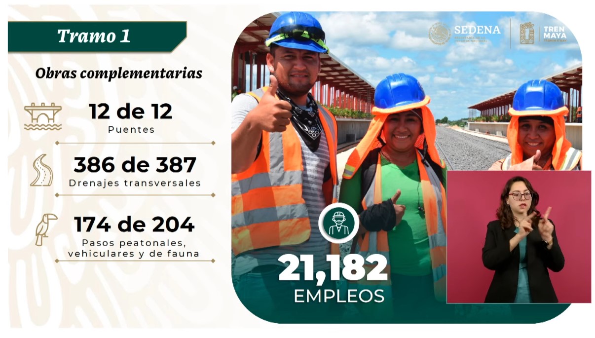 El general indicó que en el Tramo 1 de este proyecto ferroviario se podrían conocer destinos como la cascada Roberto Barrios, la Iglesia del Señor de Tila —conocida como iglesia de Colores—, el Cañón del Usumacinta y las zonas arqueológicas de Palenque, El Tigre y Moral Reforma.