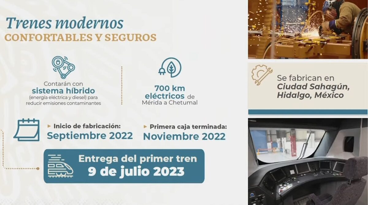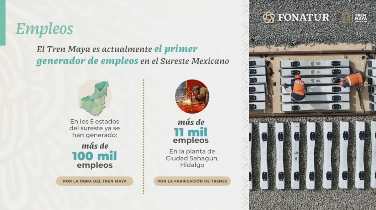 Recordó que los trenes se fabrican en ciudad de Sahagún, Hidalgo, lo que ha generado más de 11 mil empleos, también añadió que por su dimensión, el Tren Maya es el principal generador de empleo en el sureste del país, ya que se han creado más de 100 mil empleos para esta gran obra.