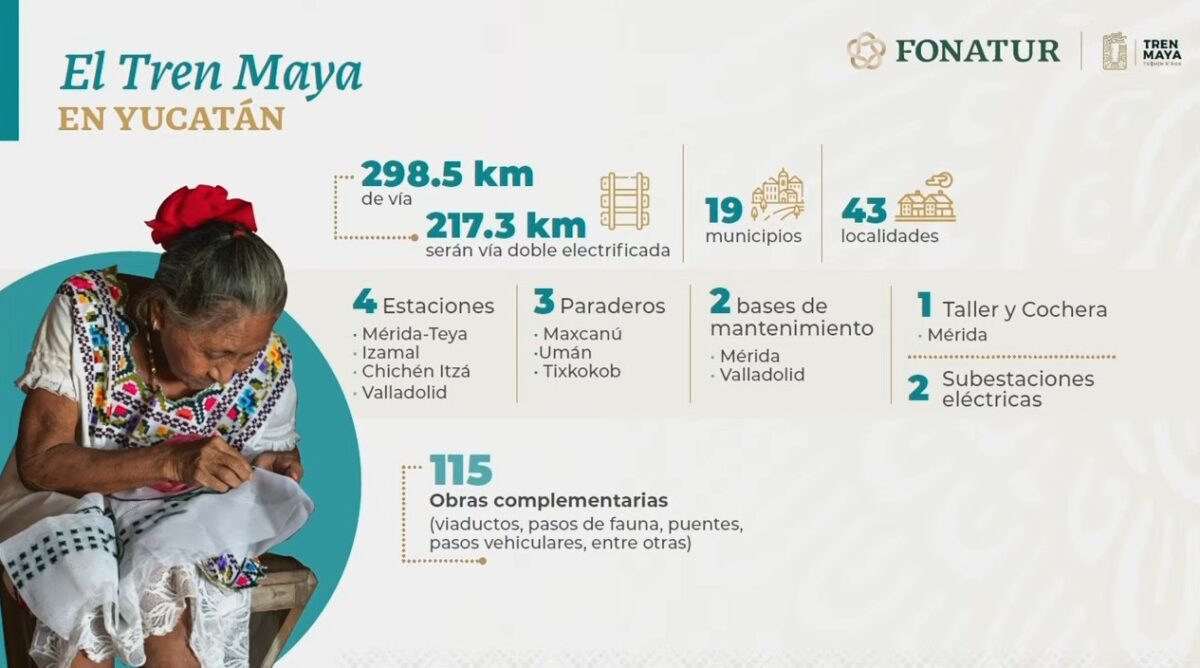 En el caso de Yucatán contará con 298 kilómetros, de los cuales 217 serán vía doble electrificada; pasará por 19 municipios y 43 localidades; en este estado habrá cuatro estaciones, tres paraderos, dos bases de mantenimiento, un taller y dos subestaciones eléctricas nuevas. Además, como parte del proyecto se construyen en la entidad 115 obras complementarias, entre viaductos, puentes, pasos de faunas y vehiculares.