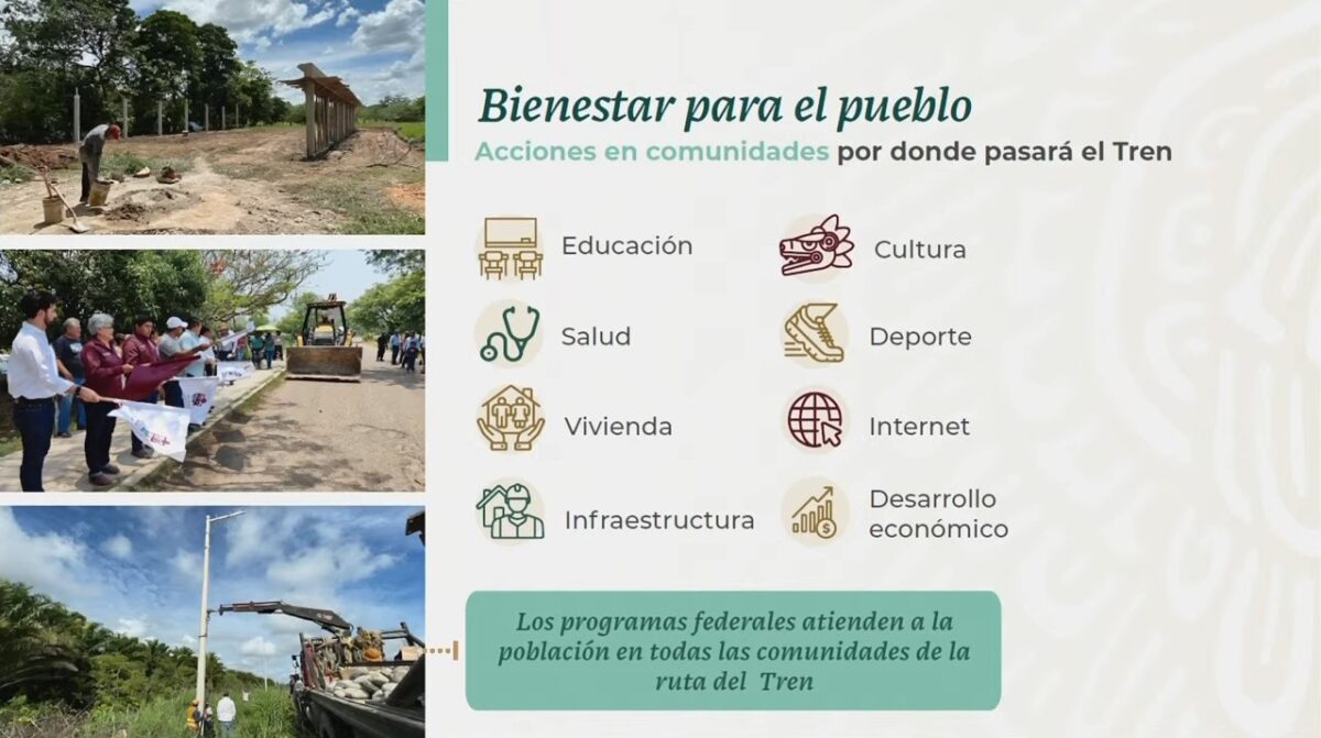 Al presentar un informe sobre los avances del proyecto en la mañanera de este viernes del presidente Andrés Manuel López Obrador, que se realiza en la zona aérea ubicada en Mérida, el funcionario refirió que éste representa “la mayor inversión pública realizada en el sureste mexicano, por lo que se llevan a cabo acciones sociales para atender las desigualdades históricas de la región, que se suman a la atención de los programas del bienestar”.