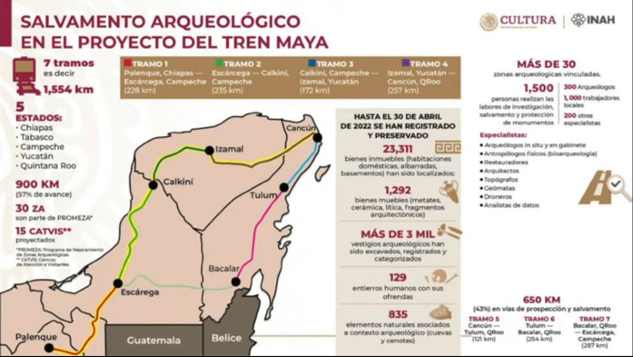 En conferencia de prensa en Palacio Nacional, el titular del Ejecutivo señaló que a la par del rescate de piezas arqueológicas en la ruta del Tren Maya hay un programa de rescate y de conservación de las grandes e importantes ciudades mayas. “Se está trabajando en Palenque, Edzna, Chichén Itzá y Tulum, (este) programa de rescate de mejora de sitios arqueólogos es parte del plan del Tren Maya”.