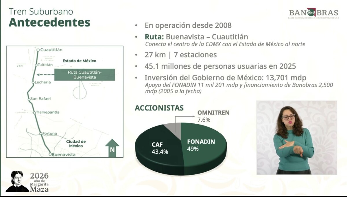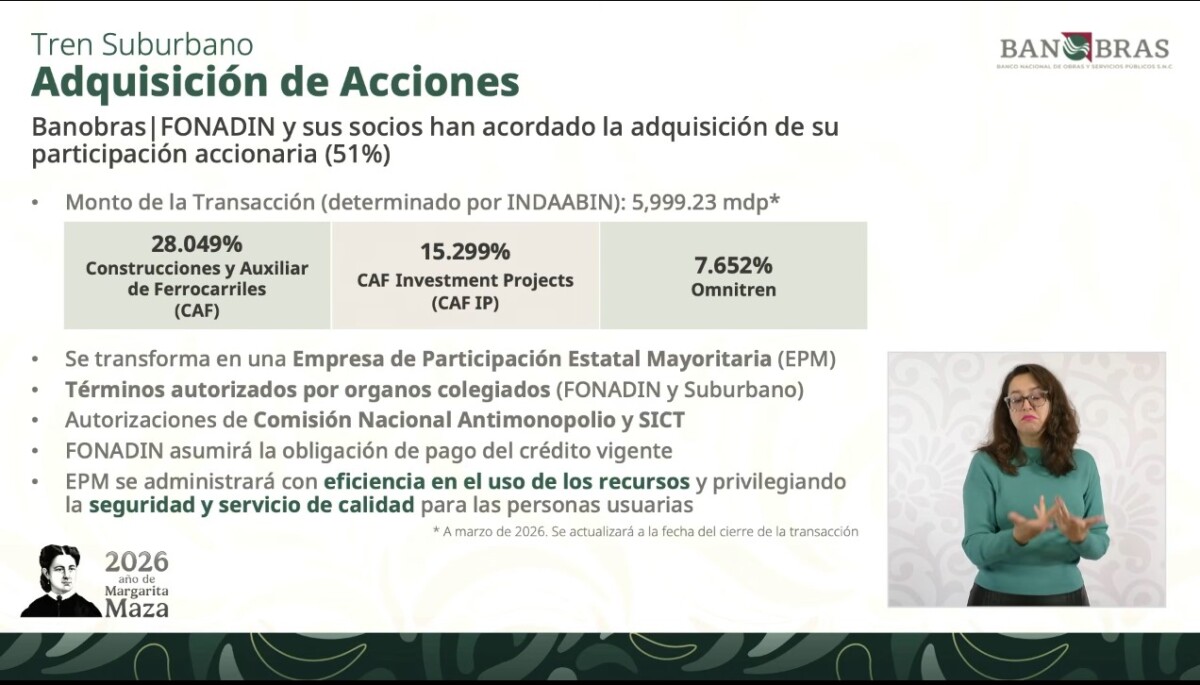 El titular del Banco Nacional de Obras y Servicios Públicos (Banobras), Jorge Mendoza Sánchez, informó que el Gobierno de México llegó a un acuerdo con las empresas CAF y Omnitren para adquirir su participación en el Tren Suburbano, con lo que el Estado mexicano obtiene el 100% de la posición accionaria de este medio de transporte.