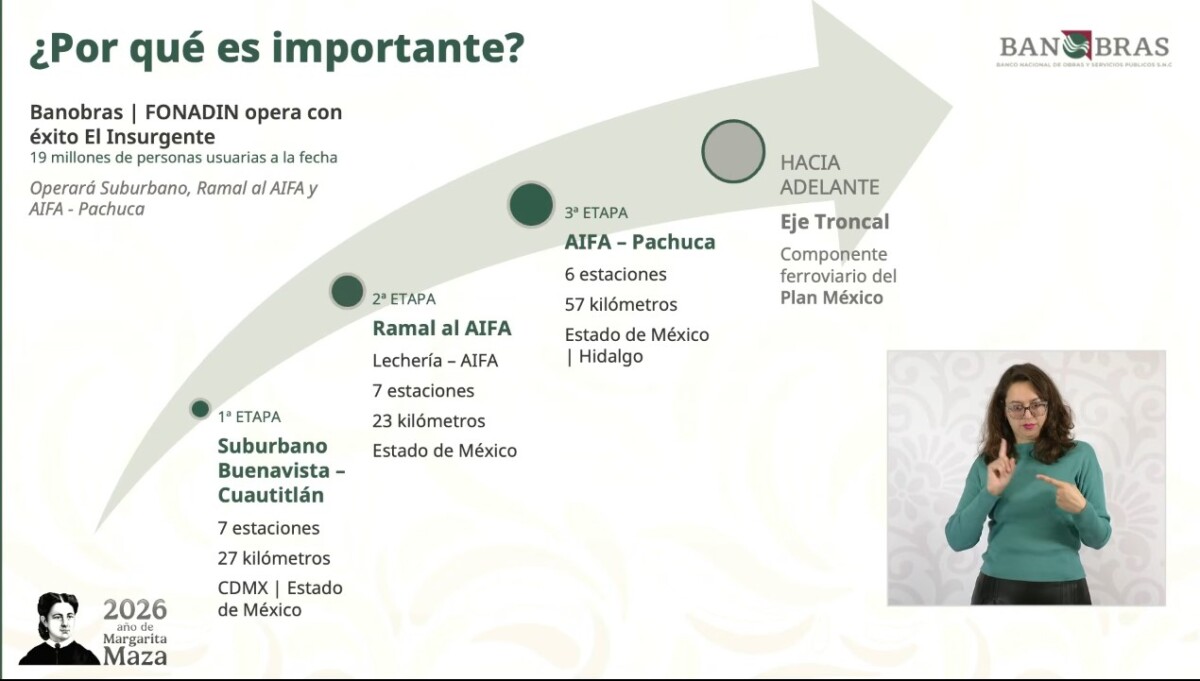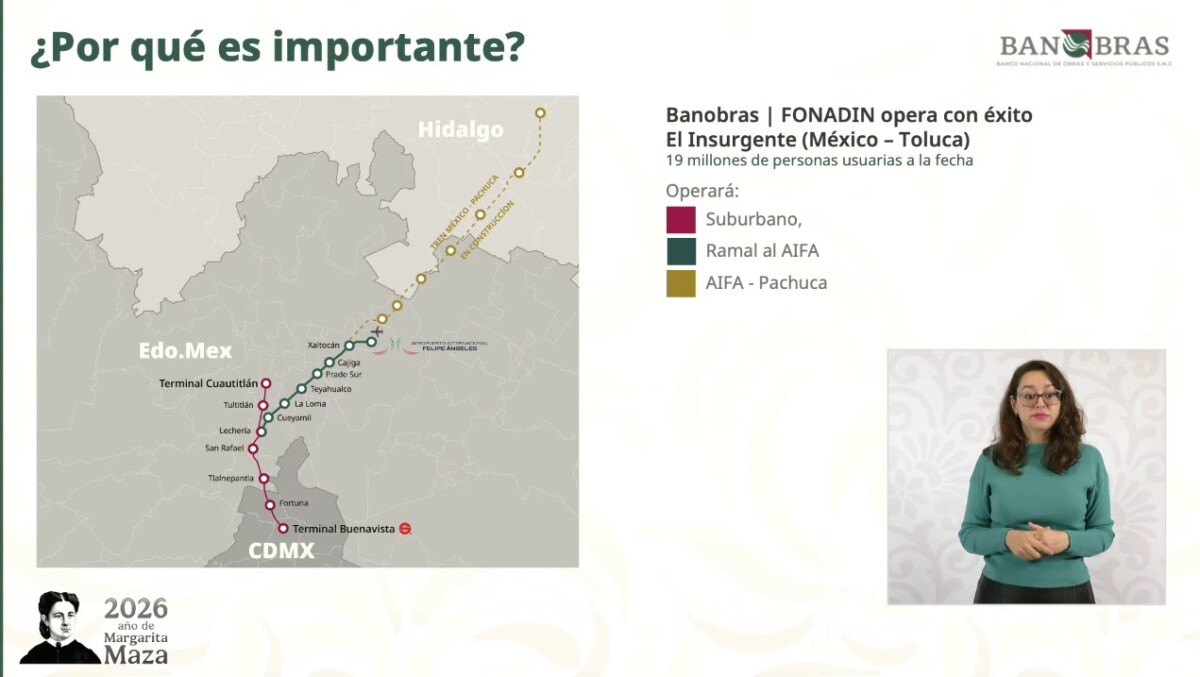 Finalmente, indicó que el sistema será operado por el FONADIN, organismo administrado por Banobras, el cual también opera el tren “El Insurgente”, que conecta la Ciudad de México con Toluca y que, en los últimos dos años y medio, ha transportado a más de 19 millones de pasajeros sin interrupciones.