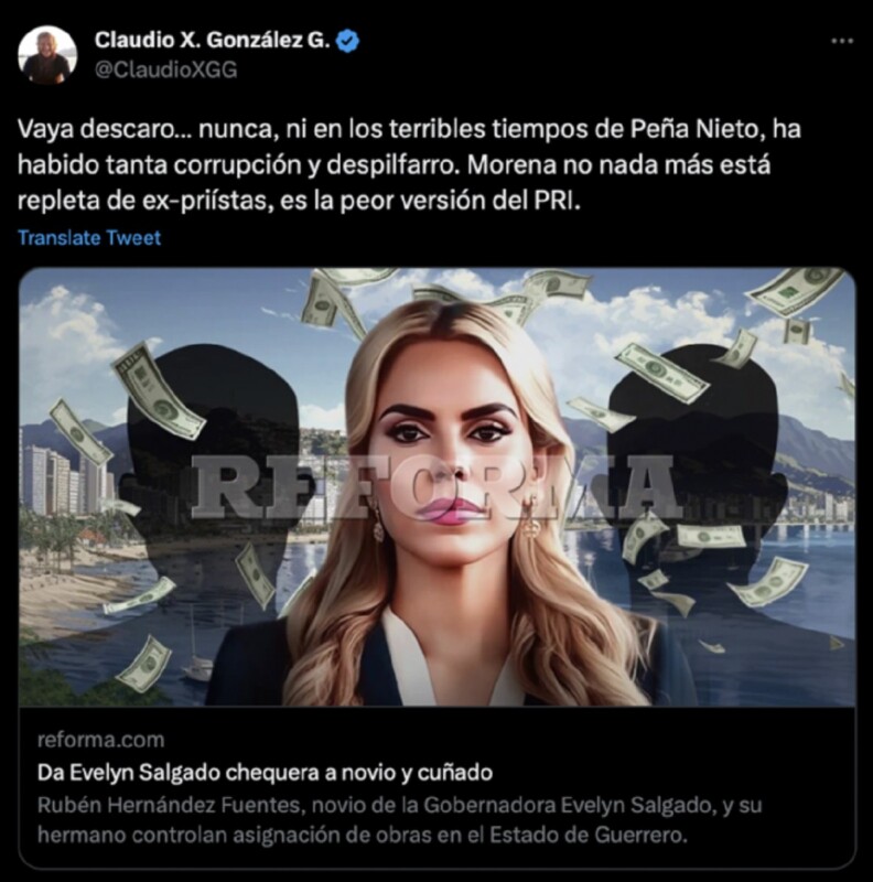 En redes sociales, el gerente de los aliancistas Claudio X. González señaló el “descaro” de la gobernadora de Guerrero, Evelyn Salgado, quien según el diario conservador Reforma, su novio y cuñado presuntamente controlarían la asignación de obras públicas en el estado.