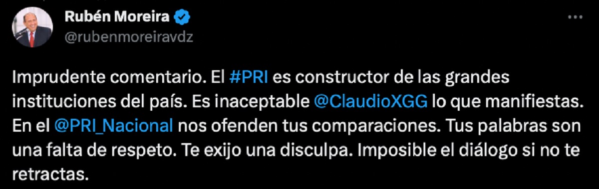 “Imprudente comentario. El PRI es constructor de las grandes instituciones del país. Es inaceptable Claudio X. lo que manifiestas. En el PRI Nacional nos ofenden tus comparaciones. Tus palabras son una falta de respeto. Te exijo una disculpa. Imposible el diálogo si no te retractas”.