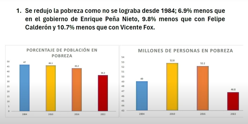 Difundió el comparativo de la evolución de la pobreza en este siglo, que pasó de 46.3 por ciento con Vicente Fox; 46.1 por ciento con Felipe Calderón; 46.3 por ciento con Enrique Peña Nieto, con 43.2 y en esta administración el 36.3.