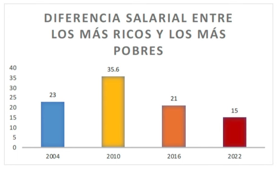 Simultáneamente se cierra la brecha salarial entre los más ricos y los más pobres: en 2010 —año correspondiente al sexenio de Calderón—, los más acaudalados llegaron a ganar 35.6 veces más que la población vulnerable; en 2022 se redujo a 15 veces, refirió el jefe del Ejecutivo.