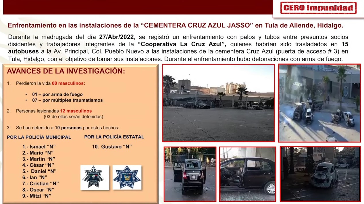 El subsecretario de Seguridad Pública de la Secretaría de Seguridad y Protección Ciudadana (SSPC), Ricardo Mejía, informó este jueves que ya fueron detenidos 10 personas, entre ellas una mujer, por el enfrentamiento con armas de fuego entre dos grupos contrarios de trabajadores en la planta cementera de Cruz Azul, ubicada en el en poblado de Jasso, en el municipio de Tula de Allende, Hidalgo, ocurrido el pasado 27 de abril.