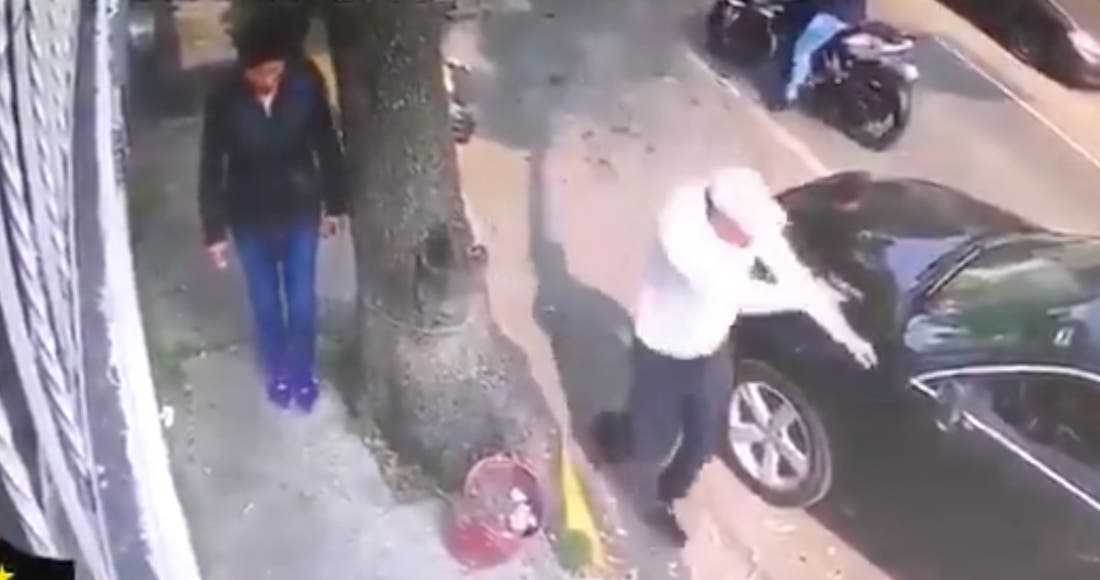 En la grabación se aprecia a los cuentahabientes estacionar el vehículo negro tipo Jetta; de pronto, aparecen dos individuos a bordo de una motocicleta, uno desciende de ella y encañona al conductor mientras su acompañante [que ya había bajado] queda estupefacto y sólo se limita a mirar.