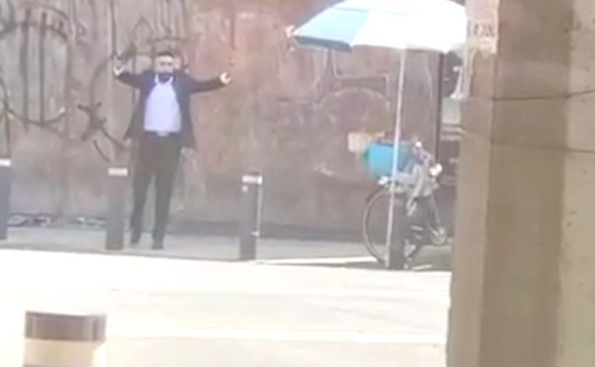 En las imágenes captadas por un testigo, se observa el momento en el que el sujeto dispara en al menos dos ocasiones y tras escuchar las sirenas de las autoridades tiró su arma hacía el piso y alza las manos para rendirse.