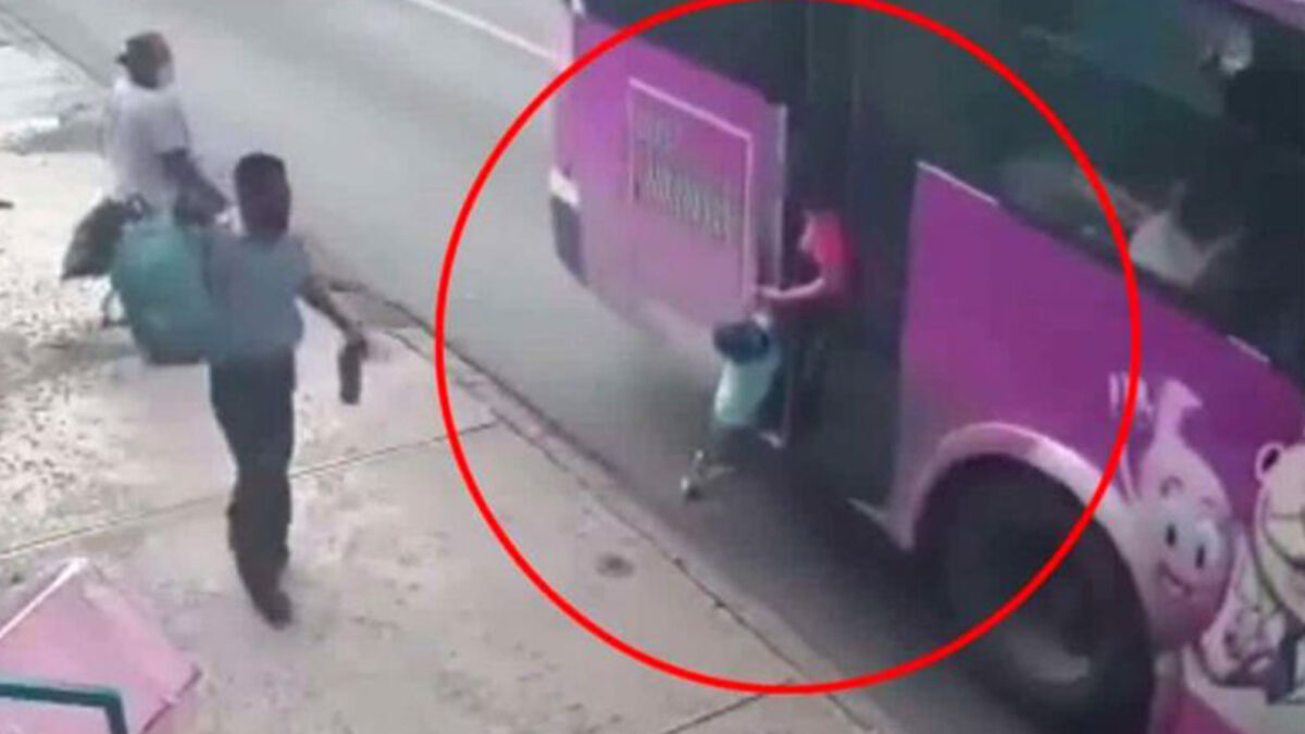 En la grabación se puede ver que la unidad de ruta avanza y el niño queda sujetado de la mano de su mamá, para ser arrastrado unos cuentos metros por la orilla de la avenida.