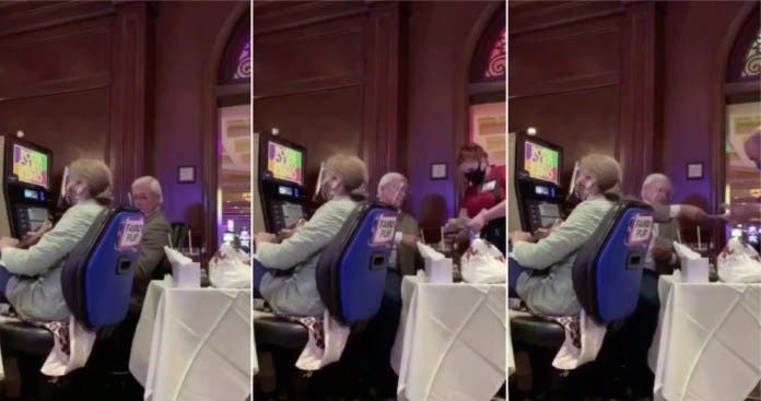Al mandatario se le ve portando una careta, sin cubrebocas, mientras un empleado del casino se acerca a la máquina para entregarle sus ganancias.