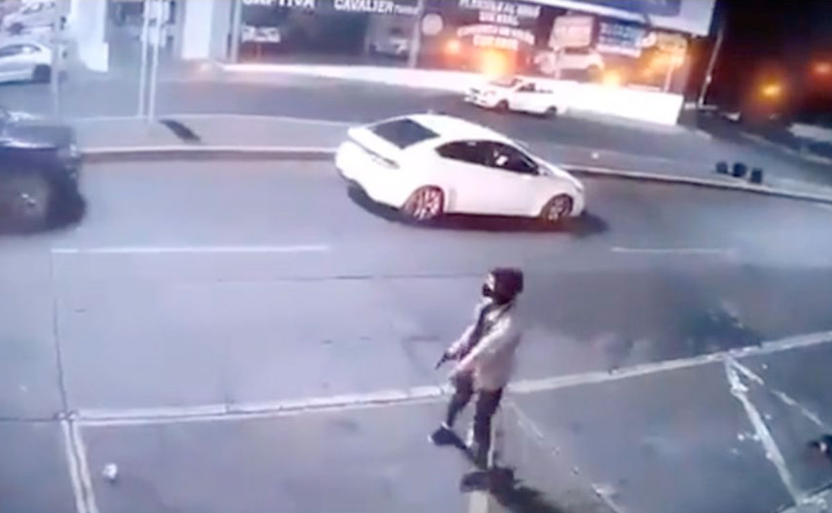En ese momento, aparece una camioneta de carga pequeña de color blanco, del vehículo descienden dos tipos (uno de ellos encapuchado) que de inmediato comienzan a disparar en contra de las personas que están en las afueras y la entrada de la cervecería.