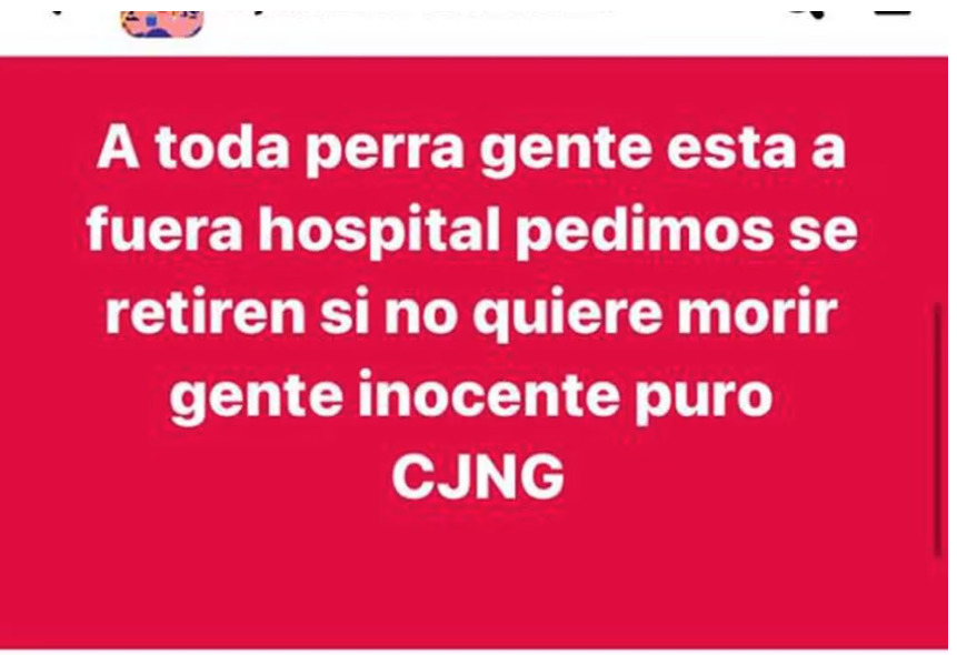 Aunque los mensajes fueron compartidos de manera anónima, uno de los textos señalaba que se trataba de o en contra del Cartel Jalisco Nueva Generación (CJNG) «A toda perra gente está afuera hospital pedimos se retire si no quiere morir gente inocente puro CJNG (sic)».