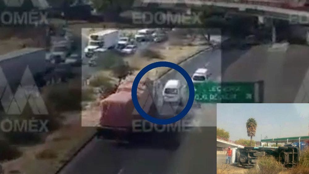Y es que el accidente quedó grabado por cámaras del C5 del Estado de México y difundidos a través de redes sociales. En las imágenes se observa que el conductor de la combi de la Ruta 49 de transporte público se cambia de carril y provoca el incidente vial.