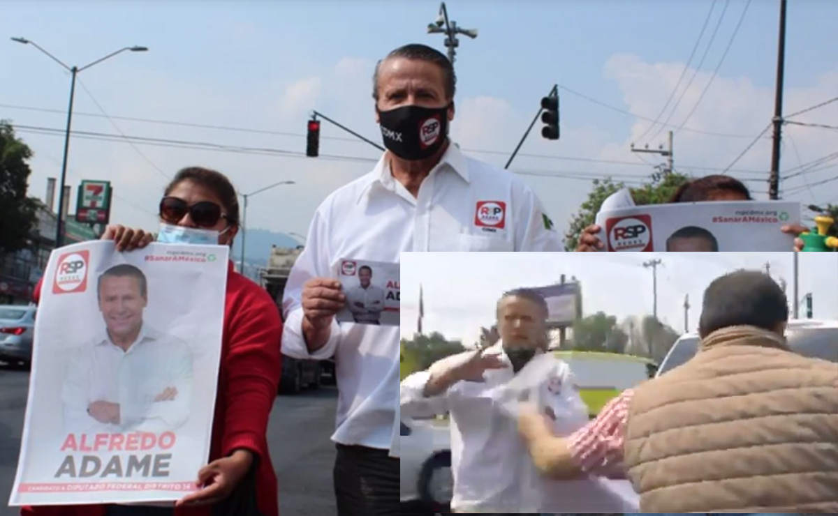 “Eres un pende…, naco, fracasado, odioso. Vas y chingas a tu mad.. ”, espetó Adame a un automovilista que sonó su claxon en medio de una entrevista que ofrecía a una medio durante su arranque de campaña en una vía pública.
