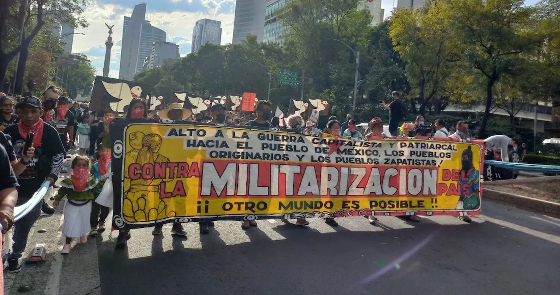 Un nutrido contingente de personas, quienes se identificaron como miembros del Congreso Nacional Indígena (CNI), organización fundada por los dirigentes zapatistas, así como diversos colectivos, marcharon este miércoles en la Ciudad de México (CDMX) contra la militarización.