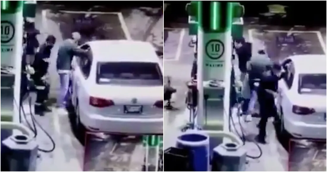 Posteriormente, los hombres suben al carro y se dan a la fuga mientras que la víctima camina por gasolinera con las manos en alto, mientras que el despachador de combustible observaba la escena a unos metros.